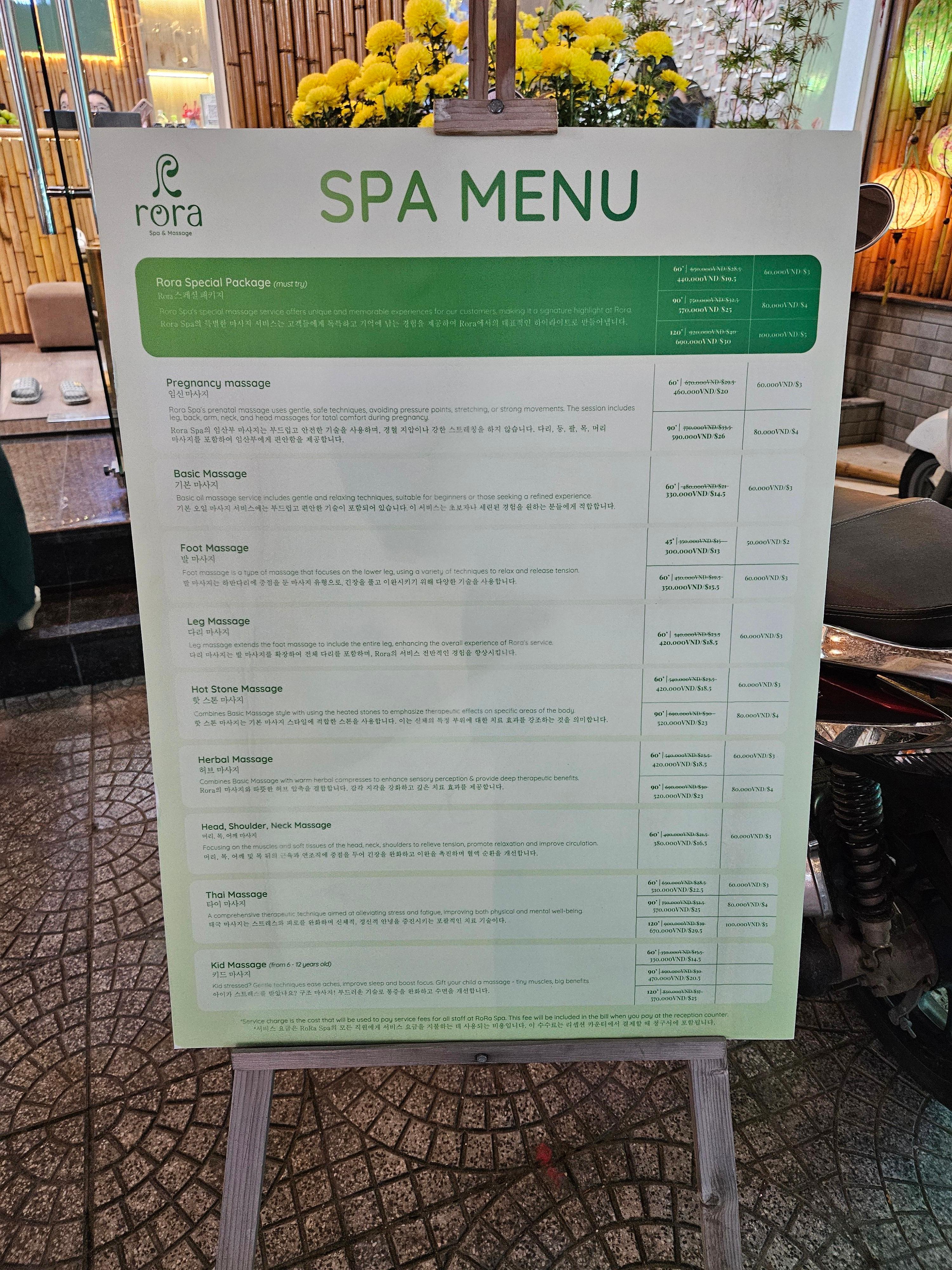 가격이 팁까지 정해져 있어서 계산하기가 편했고, 여러 마사지를 받을 수 있는 로라 스페셜 코스가 있어서 코스 선택이 편했던 것 같아요.